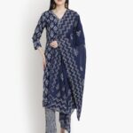 Introducing the Elegant Pair Blue Ladies Suit by Aksha, a sophisticated ensemble that exudes elegance and style. This suit set comprises a finely crafted kurta, trousers, and a matching printed dupatta, all meticulously designed using premium Cotton Cambric fabric.