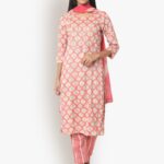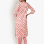 - Trellis Print Trousers: The trousers feature a chic trellis print that adds visual interest and uniqueness to the ensemble. This print adds sophistication and complements the soft pink kurta beautifully.