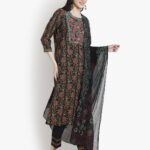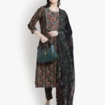 Invest in the Fashionably Paired Black Women Ladies Suit by Aksha and embrace its sophistication, versatility, and craftsmanship. With its classic black color, floral printed ankle-length trousers, chiffon dupatta, and meticulous manual work, this suit set is sure to make a stylish statement wherever you go.