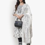 Invest in the Urban Unite Cream Women Ladies Suit by Aksha and embrace its refined color combination, impeccable craftsmanship, and versatile design. With its chic white and black blend, paisley print trousers, chiffon dupatta, and meticulous manual work, this suit ensemble is a fashion statement that exudes sophistication and elegance.