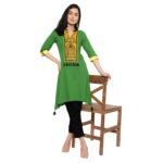 Flaunt your elegance with this elegant, graceful, and artistic Yellow-Green C Cut Kurti designed from the house of Aksha Lifestyle. Look classy and sassy with this in this piece and celebrate the comfort and style of this cotton cambric fabric.